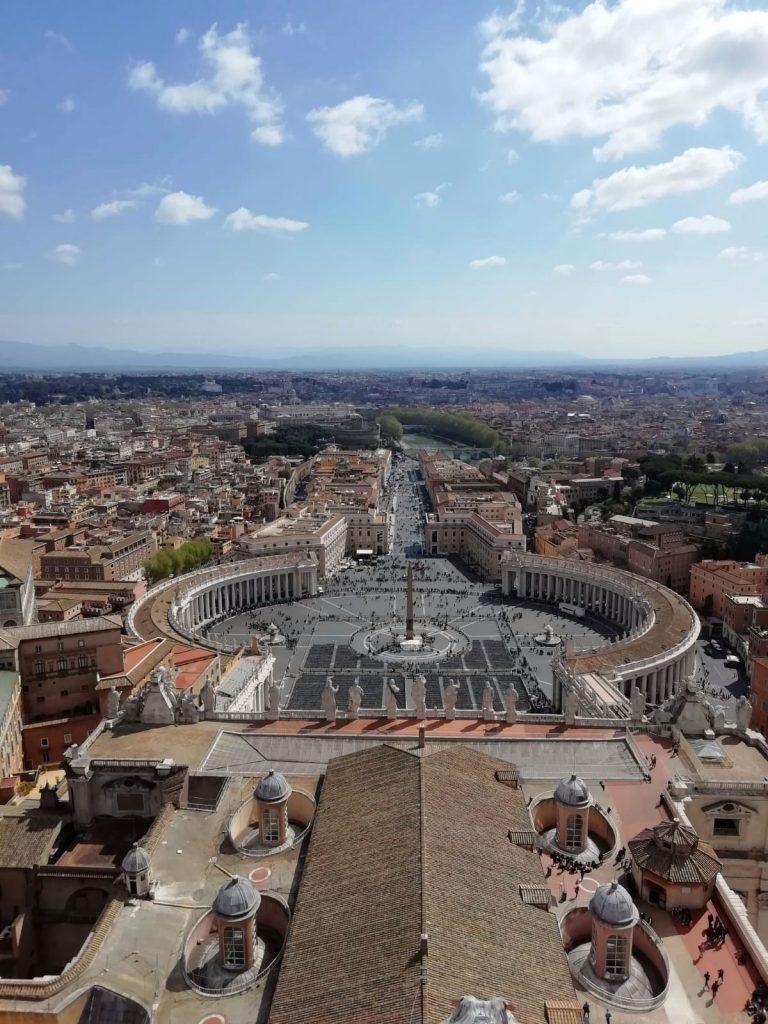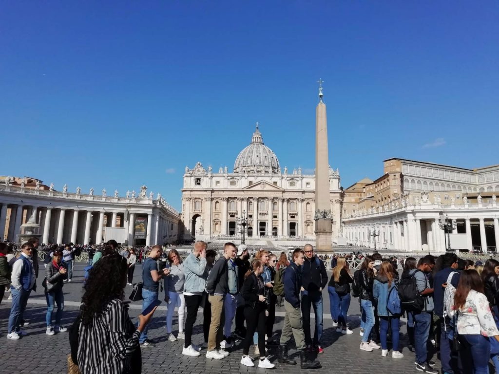 Opintomatkan toinen päivä alkoi hotellin hyvällä aamiaisella, jonka jälkeen me kokoonnuttiin ja jatkettiin metrolla Colosseum:lle, jonne sisälle ei päästy, mutta johon päästään käymään eri päivänä. Colosseum:lta matkustettiin bussilla Vatikaaniin, jossa päästiin nousemaan 511 askelta portaita ylös Pietarin kirkon kupoli päälle. Sieltä näkyi hyvin Rooman kaupungin nähtävyydet ja kaupunki. Pidimme sen jälkeen ruokatauon Vatikaanin ruokapaikoissa ja sen jälkeen menimme Vatikaanin museoon, jossa saatiin nähdä kuuluisia taideteoksia ja veistoksia. Niihin kuului Michelangelon kuuluisa kattomaalaus “Gods creation of humanity” ja veistos “Laocoön”. Viimeiseen kohteeseen käveltiin, joka oli Sant’Angelon linna, missä näkyi hyvin Tiberin joki ja linnan arkkitehtuuria. Tämän jälkeen loppupäivä oli opiskelijoille vapaa.
