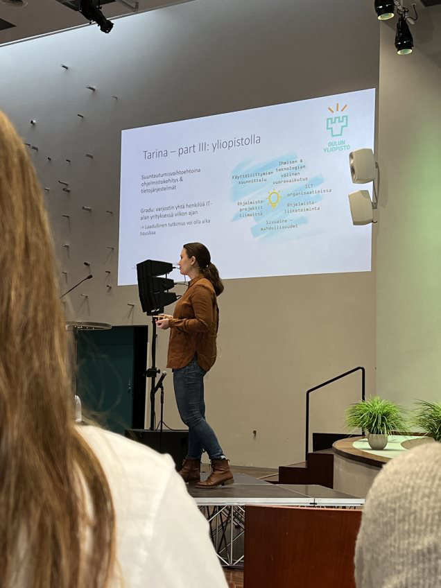 Tapahtumassa esiintynyt tutkijatohtori Fanny Vainionpää kertoi puheenvuorossaan omasta urapolustaan vaikuttavasti. Vainionpää kertoi lähteneensä opiskelemaan ammattikorkeakouluun lukion päätyttyä. Matka tohtoriksi oli useiden sattumien summa ja suurimmaksi osaksi seurausta siitä, kuinka omaa kiinnostustaan seuraamalla voi päästä pitkälle ja lopulta löytää oman juttunsa. Vainiopää korostikin puheessaan: “Ikinä ei ole valmis, mutta kiinnostusta seuraamalla voi löytää innostavia hommia.”