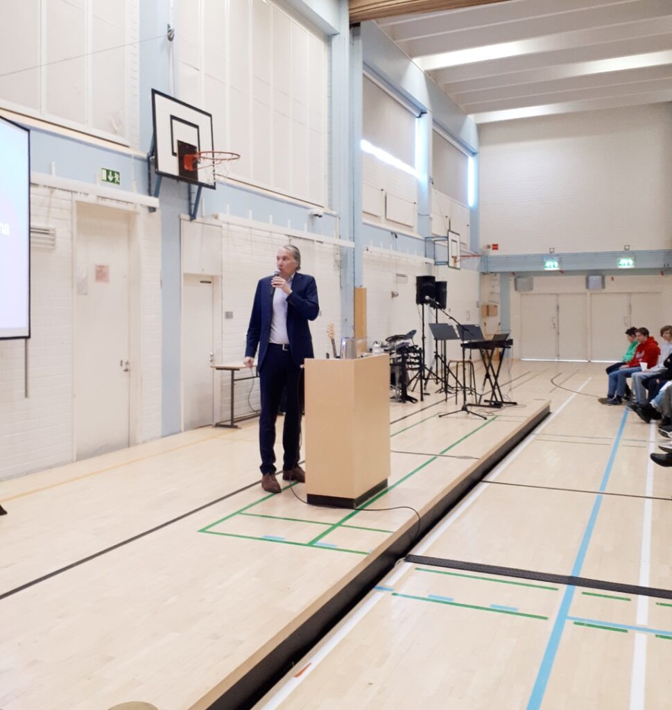 Porkkalan lukiossa opiskelijat kokoontuivat aamupäivällä saliin kuuntelemaan Eurooppa-päivän vieraita: Euroopan historian professori Laura Kolbea ja tulevaisuudentutkija Aleksi Neuvosta. Tilaisuus alkoi rehtori Matti Auteron avauspuheella, jossa hän tiivisti Eurooppa-päivän kansainvälisen merkityksen ja esitteli vieraat.