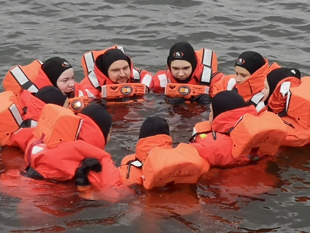 Ensin kävimme läpi 72 tunnin varautumisen ohjeita ja sitä, kuinka toimia silloin, jos tulisi joku tällainen tilanne. Seuraavana ohjelmassa oli kuivapukujen päälle pukeminen ja mereen hyppääminen. Pääsimme kokeilemaan uimista ja harjoittelimme, kuinka toimia, jos tippuisi mereen alukselta. Aluksi puku päällä tasapainon löytäminen vedessä oli kovin vaikeaa ja oli koko ajan vähällä horjahtaa eteen- tai taaksepäin. Kuivapukujen kokeileminen oli varmasti yksi hauskimmista asioista viikonlopussa, vaikka puvut päällä merestä nouseminen tikkaita pitkin oli todella vaikeaa!