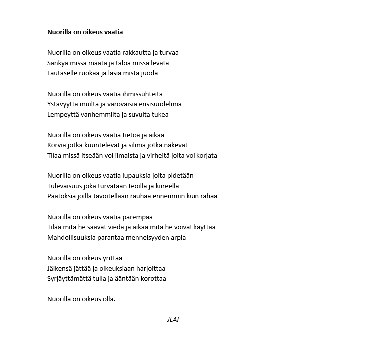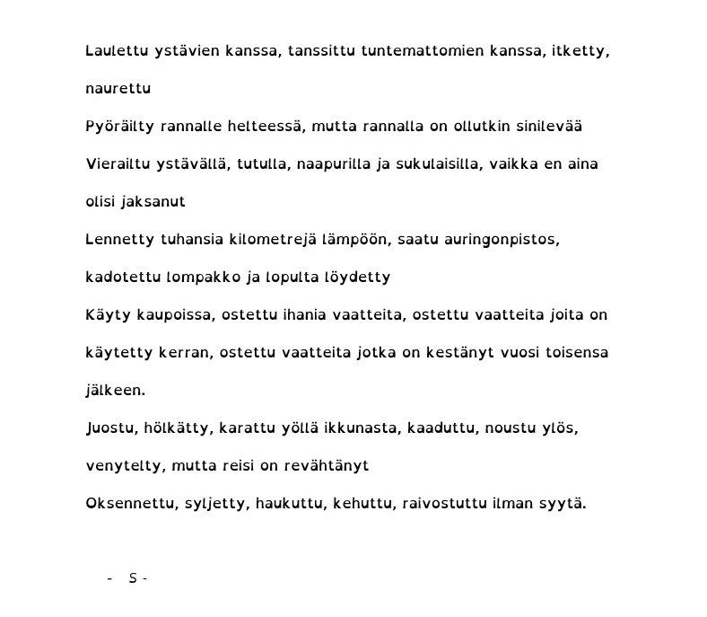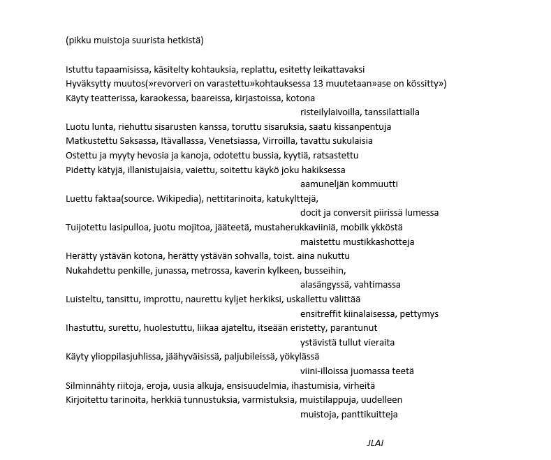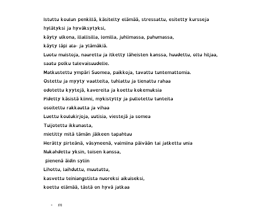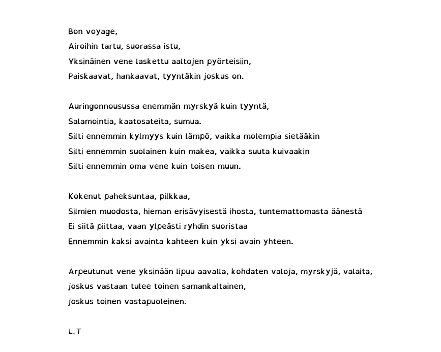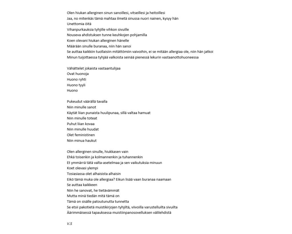 Sanataiteen työpajassa (ÄIm12) harjoitellaan luovaa, vapaamuotoista ja kokeilevaakin kirjoittamista. Ohessa pääset lukemaan maistiaisia opintojaksolla kirjoitetuista runoista. Jos sinua kiinnostaa sanataide ja haluaisit välillä kirjoittaa muutakin kuin koevastauksia ja muita asiatekstejä, valitse opintojakso ensi vuoden lukujärjestykseesi. ÄIm12 tarjotaan näillä näkymin lukuvuonna 2024-25 periodissa 4.