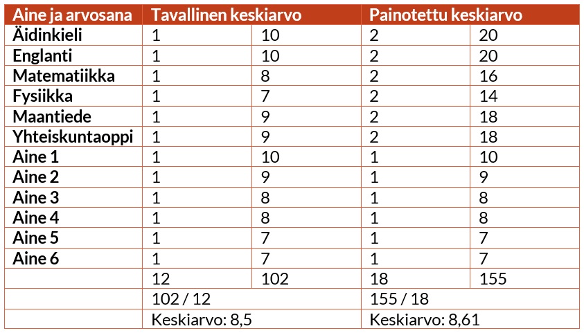 Esimerkki painotetun keskiarvon laskemisesta: